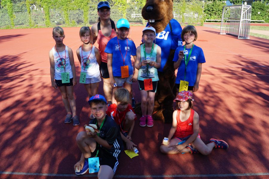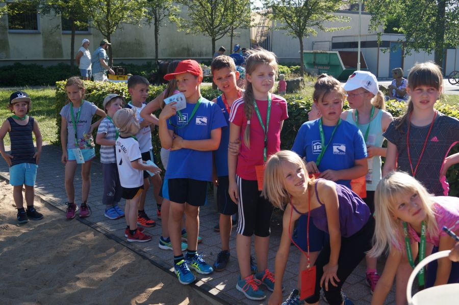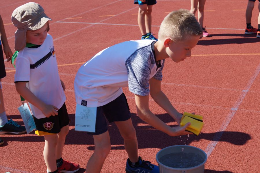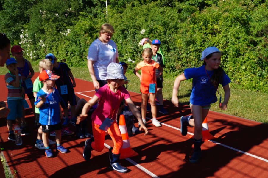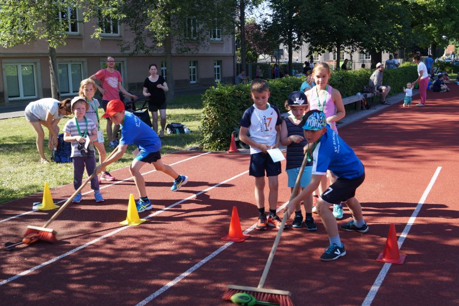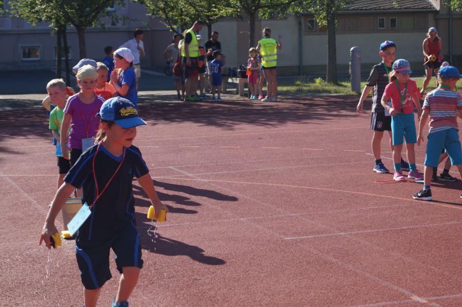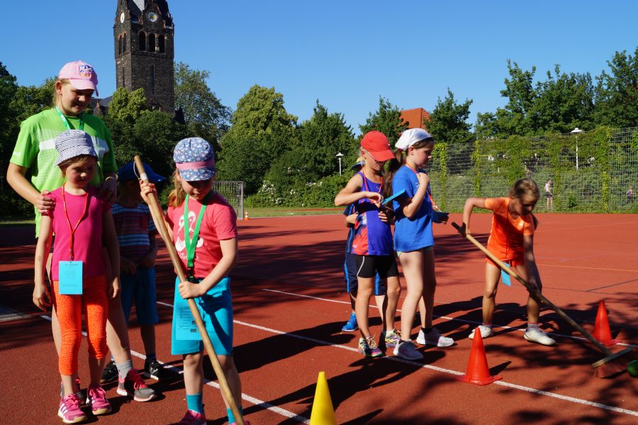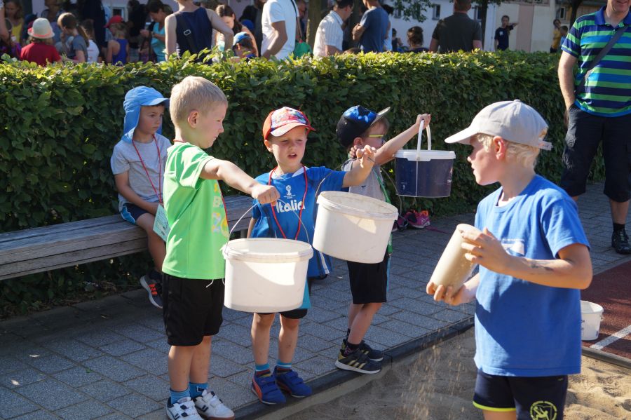Die Sonne drückte unermüdlich, aber davon ließen sich die Kinder nicht abhalten. Nach einer kleinen gemeinsamen Erwärmung wurden Stationskarten verteilt und es galt, 8 nicht ganz ernst gemeinte Stationen zu absolvieren. In Gruppen aufgeteilt machten sich die Kinder ans Werk. Egal ob Wattestäbchenweitwurf, Gummistiefelwettrennen, Pantoffellauf, Pferderennen im Sand, Wassertransport, Besenrugby, Sandeimerstemmen oder Zielwurf, die Kinder holten sich überall ihr „erledigt“ auf der Karte. Zwischendurch musste unbedingt immer etwas getrunken werden. Auch wenn es diesmal nicht um Bestweiten und schnelle Zeiten ging, waren die Sportler motiviert und wollten es gut machen. Schließlich gab es eine Medaille oder eine Anlaufmarkierung zu gewinnen.