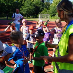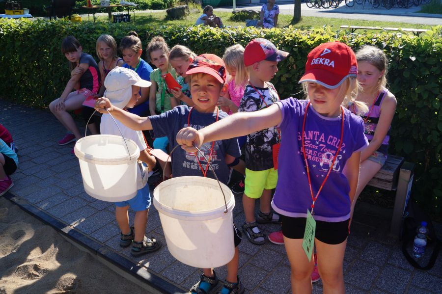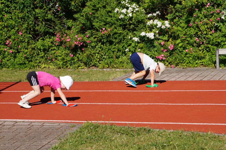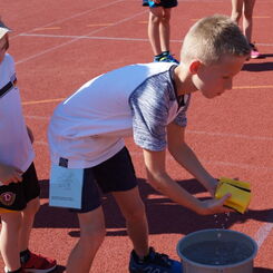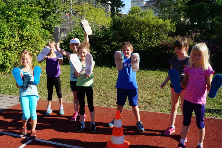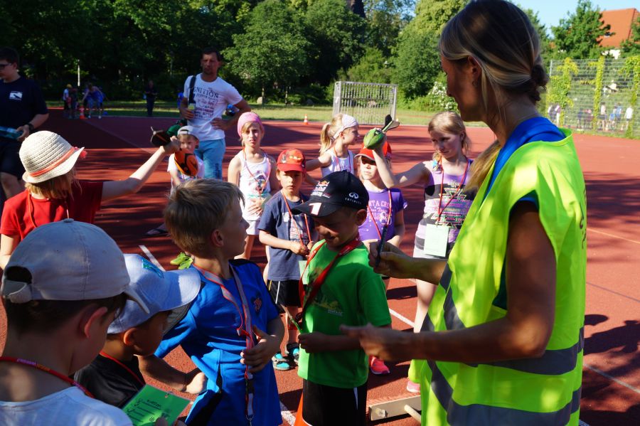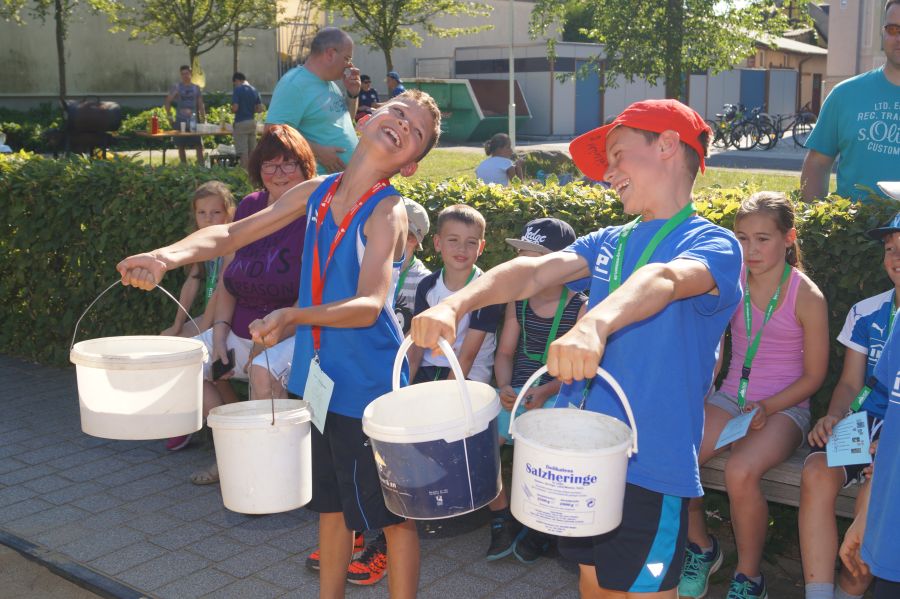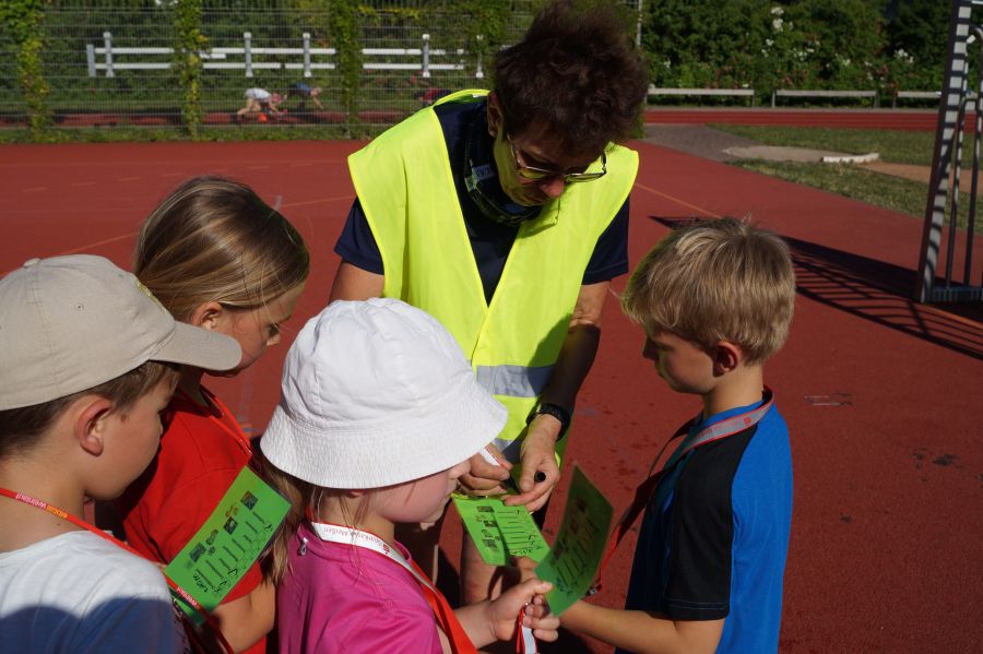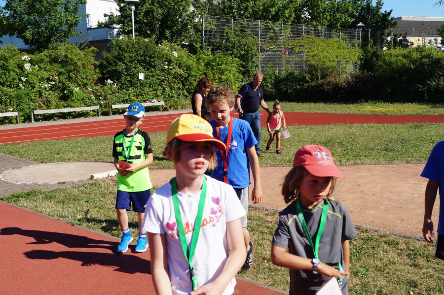 Die Sonne drückte unermüdlich, aber davon ließen sich die Kinder nicht abhalten. Nach einer kleinen gemeinsamen Erwärmung wurden Stationskarten verteilt und es galt, 8 nicht ganz ernst gemeinte Stationen zu absolvieren. In Gruppen aufgeteilt machten sich die Kinder ans Werk. Egal ob Wattestäbchenweitwurf, Gummistiefelwettrennen, Pantoffellauf, Pferderennen im Sand, Wassertransport, Besenrugby, Sandeimerstemmen oder Zielwurf, die Kinder holten sich überall ihr „erledigt“ auf der Karte. Zwischendurch musste unbedingt immer etwas getrunken werden. Auch wenn es diesmal nicht um Bestweiten und schnelle Zeiten ging, waren die Sportler motiviert und wollten es gut machen. Schließlich gab es eine Medaille oder eine Anlaufmarkierung zu gewinnen.