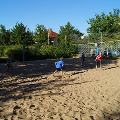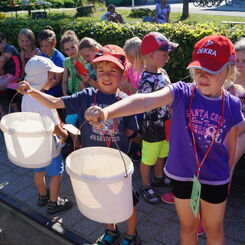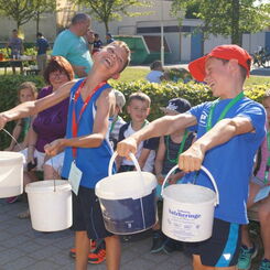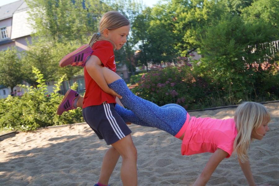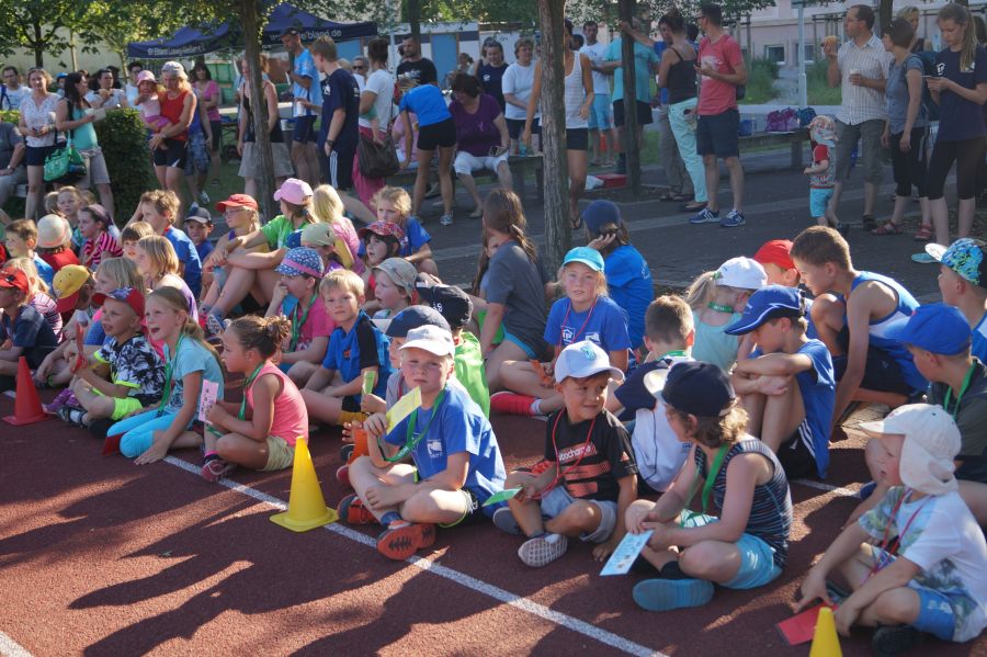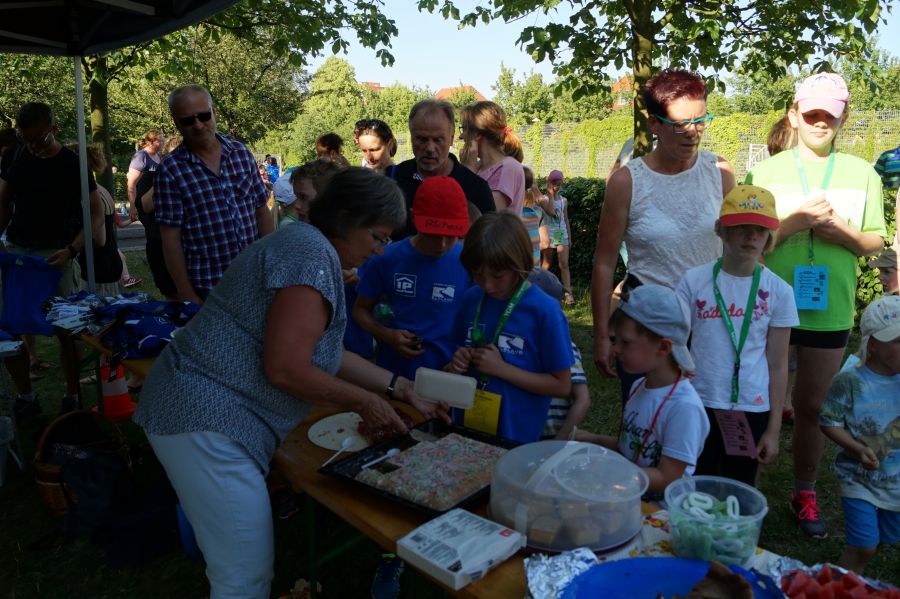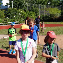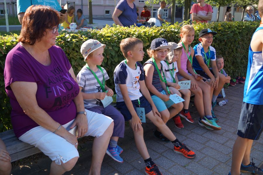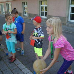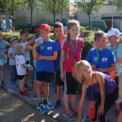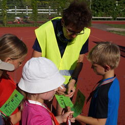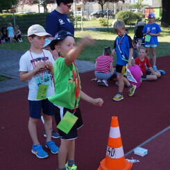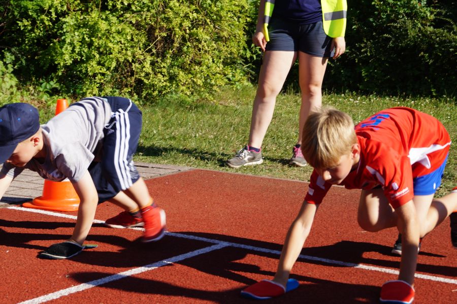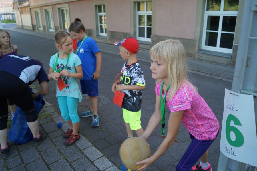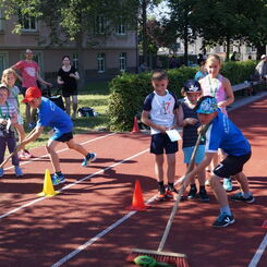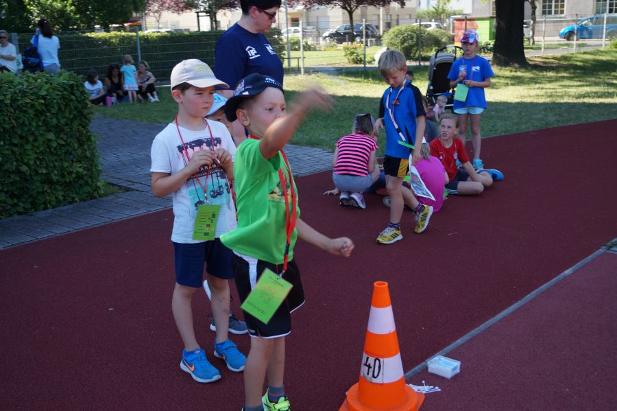 Die Sonne drückte unermüdlich, aber davon ließen sich die Kinder nicht abhalten. Nach einer kleinen gemeinsamen Erwärmung wurden Stationskarten verteilt und es galt, 8 nicht ganz ernst gemeinte Stationen zu absolvieren. In Gruppen aufgeteilt machten sich die Kinder ans Werk. Egal ob Wattestäbchenweitwurf, Gummistiefelwettrennen, Pantoffellauf, Pferderennen im Sand, Wassertransport, Besenrugby, Sandeimerstemmen oder Zielwurf, die Kinder holten sich überall ihr „erledigt“ auf der Karte. Zwischendurch musste unbedingt immer etwas getrunken werden. Auch wenn es diesmal nicht um Bestweiten und schnelle Zeiten ging, waren die Sportler motiviert und wollten es gut machen. Schließlich gab es eine Medaille oder eine Anlaufmarkierung zu gewinnen.