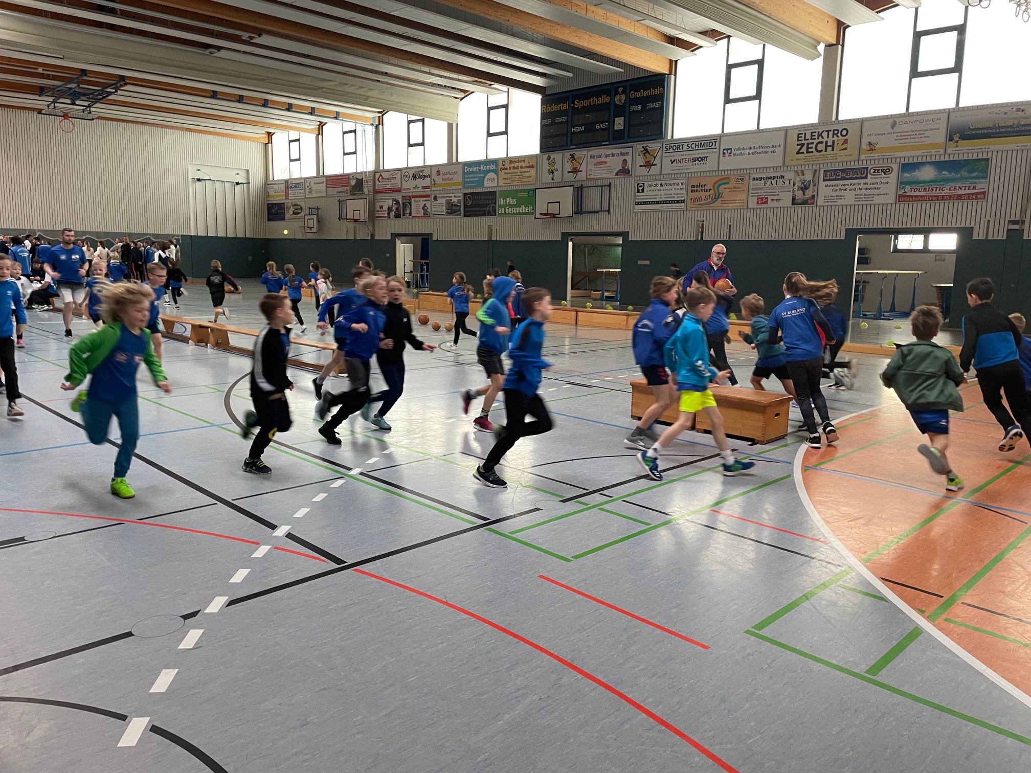 Am 10.3. hieß es für 40 Elbländer: wir treffen uns 8 Uhr in der Turnhalle in Großenhain zum Hallenwettkampf. Das war die erste sportliche Herausforderung. Nach einer gemeinsamen Erwärmung wurden die Kinder in ihre jeweilige Riege aufgeteilt und durften sich im 30m Sprint, Medizinballstoßen, Dreierhopp bzw. Schlusssprung, Rundenlauf und Staffellauf messen. Für einige war es der erste Wettkampf, andere wussten schon, wie es in etwa langläuft.