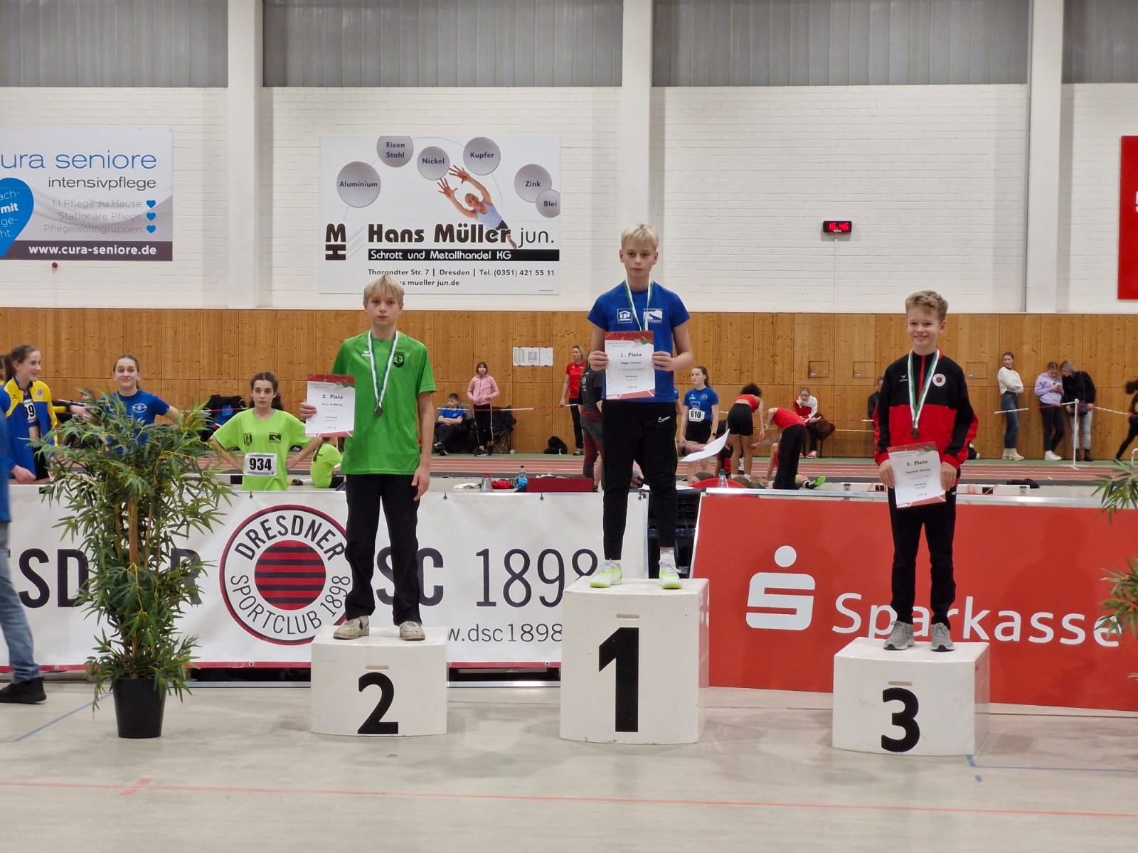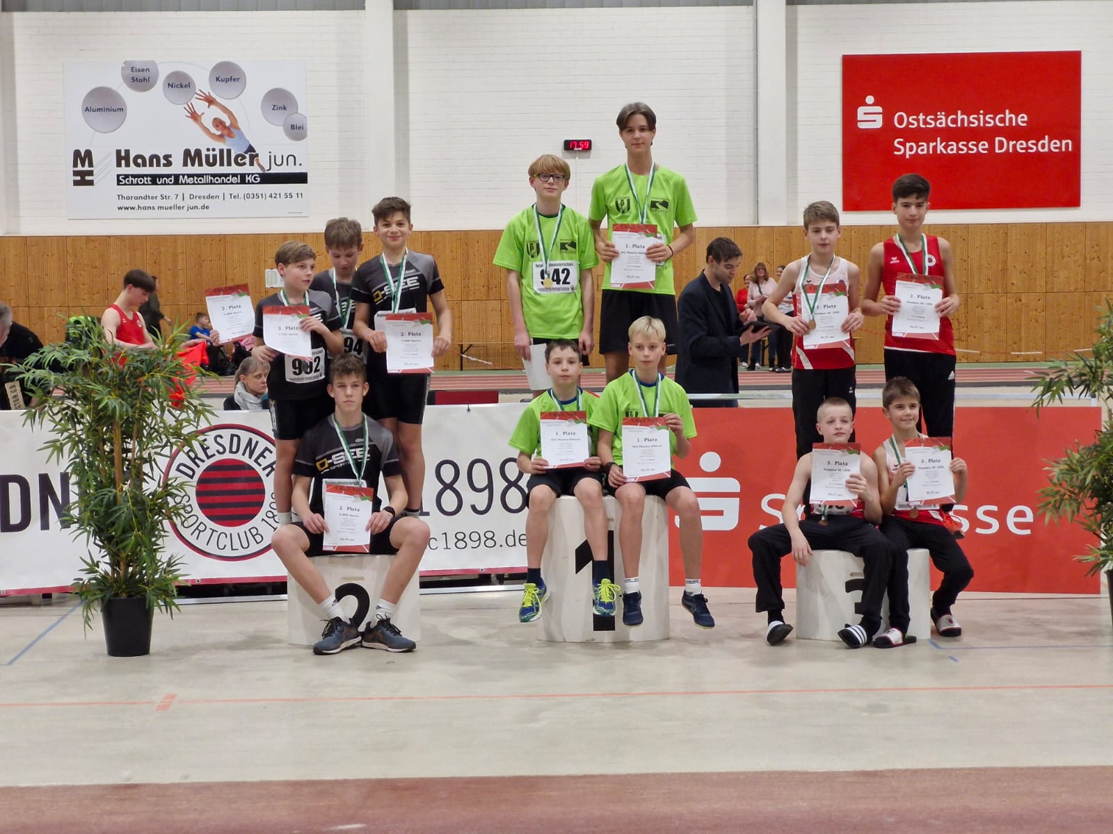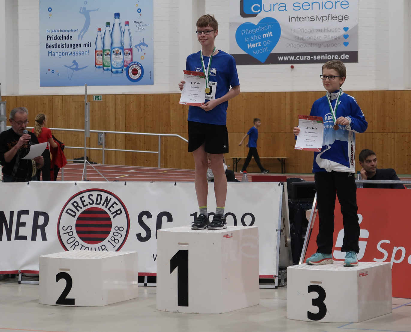Die erste Medaille an diesem Tag ersprang sich Ferdinand Däbler. Er belegt in der M12 mit 4,44m im Weitsprung den dritten Platz. In der gleichen Altersklasse konnte Edgar Günzel im Hochsprung mit 1,40m sogar den Titel Ostsächsischer Meister erkämpfen. Ferdinand und Edgar starteten noch im 60m Sprint, wo sie ebenfalls neue Bestleistungen aufstellten.