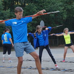 danach sind wir zum Frühstück. Nach diesem hatten wir eine kurze Pause in der wir unsere Sachen gepackt haben. Danach fuhren wir zum Sportplatz Als Trainingseinheit im Stadion haben wir Speerwurf und Dreisprung geübt und Ball.