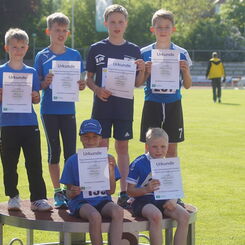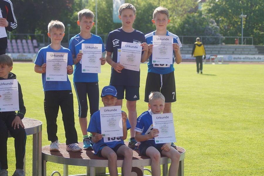 Ähnlich durchwachsen, aber dennoch super, lief es bei den Jungen der U12. Richard Gärtner und Richard Däbler sorgten im Hochsprung für Staunen, denn sie erreichten Höhen, mit denen keiner gerechnet hatte (1,29m und 1,26m übersprungen). Auch hier kostete der 50m Sprint Punkte und der Staffellauf war nicht ganz optimal. Weitsprung und Ballwurf waren fast wie eingeplant und auch hier musste der 800m Lauf die Entscheidung bringen. Ein klein wenig liebäugelten alle mit Platz 2. Doch da war noch nicht klar, wieviele Punkte vorher eingebüßt wurden. Tim Rudolph und Richard Gärtner gaben alles über die 2 Runden und liefen starke Zeiten, die auch gute Punkte brachten. Doch bei 5 Disziplinen muss es eben doch überall richtig gut sein, um ganz vor mitzumischen. Am Ende jubelten die Jungs trotzdem über einen wunderbaren dritten Platz hinter den beiden Mannschaften vom DSC und sie ließen 5 weitere Mannschaften hinter sich. Ganz stark!