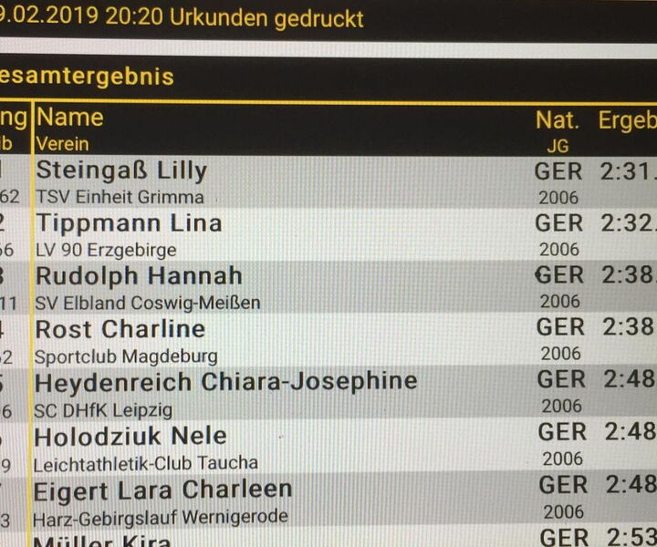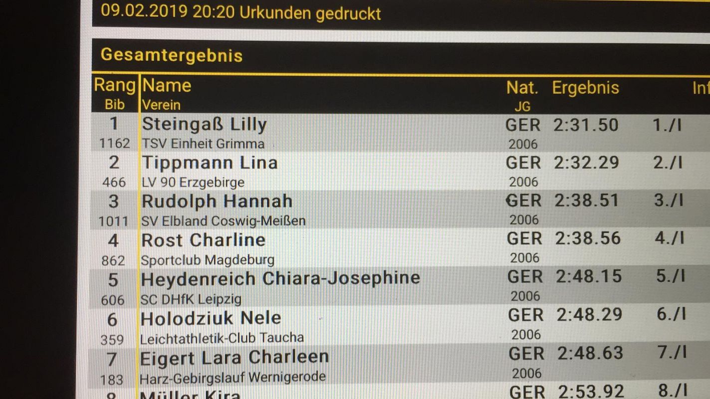 Bei der w13 gingen zwölf Mädels an den Start. Hannah Rudolph erkämpfte sich in mit einer Zeit von 2:38,51 min. den dritten Platz.