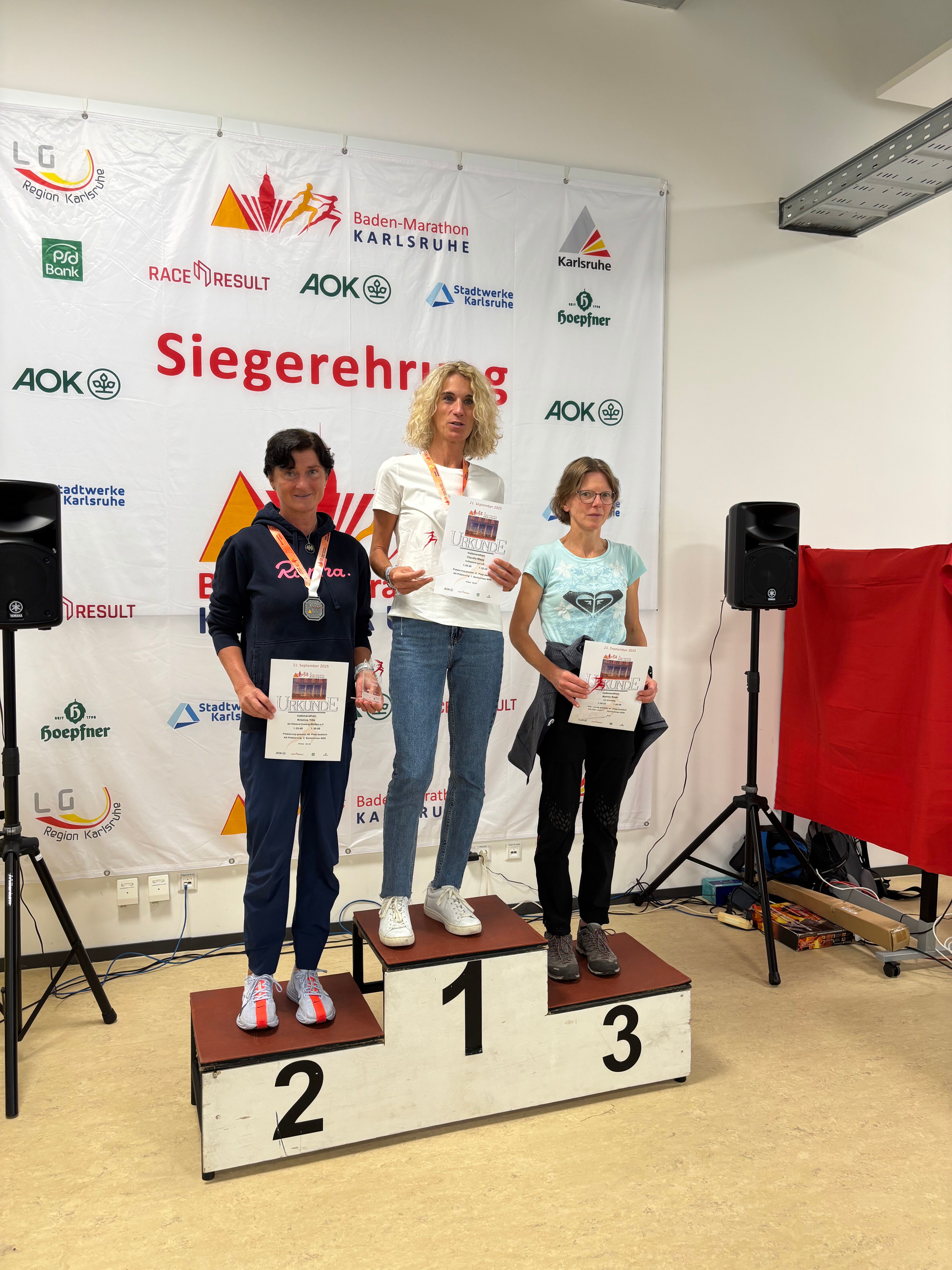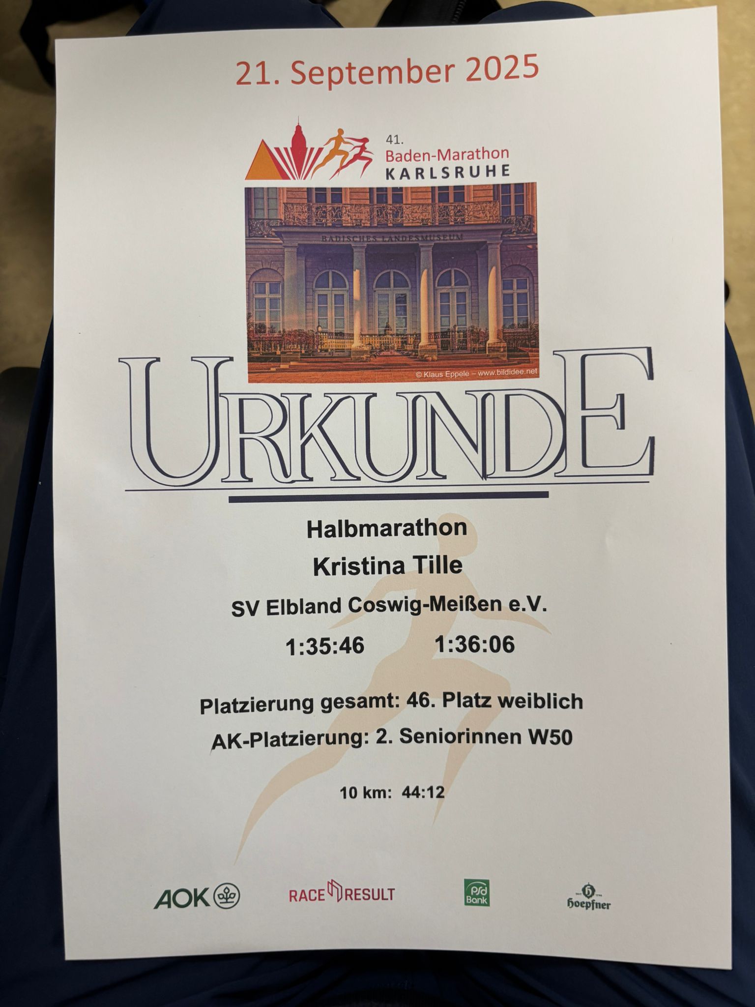 In Karlsruhe gab es 6200 Finisher. Davon belegte ich Platz 444. Es kamen 2330 Frauen ins Ziel. Im Frauenfeld belgte ich Platz 46. In meiner AK finishten 95 Frauen. In dieser Wertung belegte ich Platz 2.