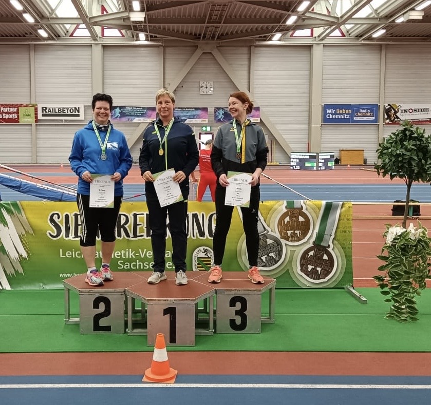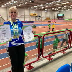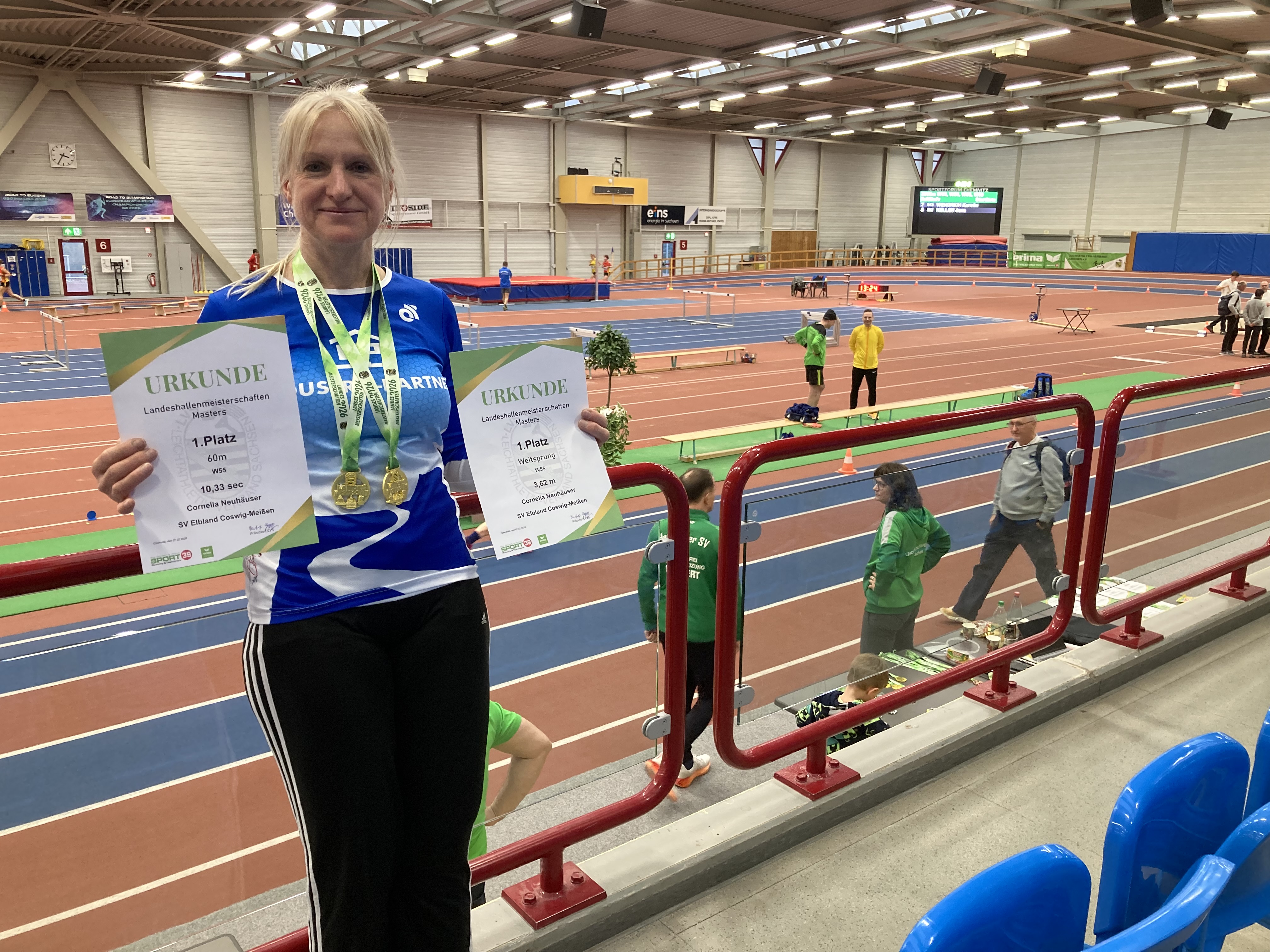 Conny Neuhäuser (W55) kämpfte gegen sich selbst und die eigene Aufregung. So sprintete sie die 60m in 10,33s und kam im Weitsprung auf gute 3,62m. Sie wurde in ihrer Altersklasse jeweils Landesmeisterin.