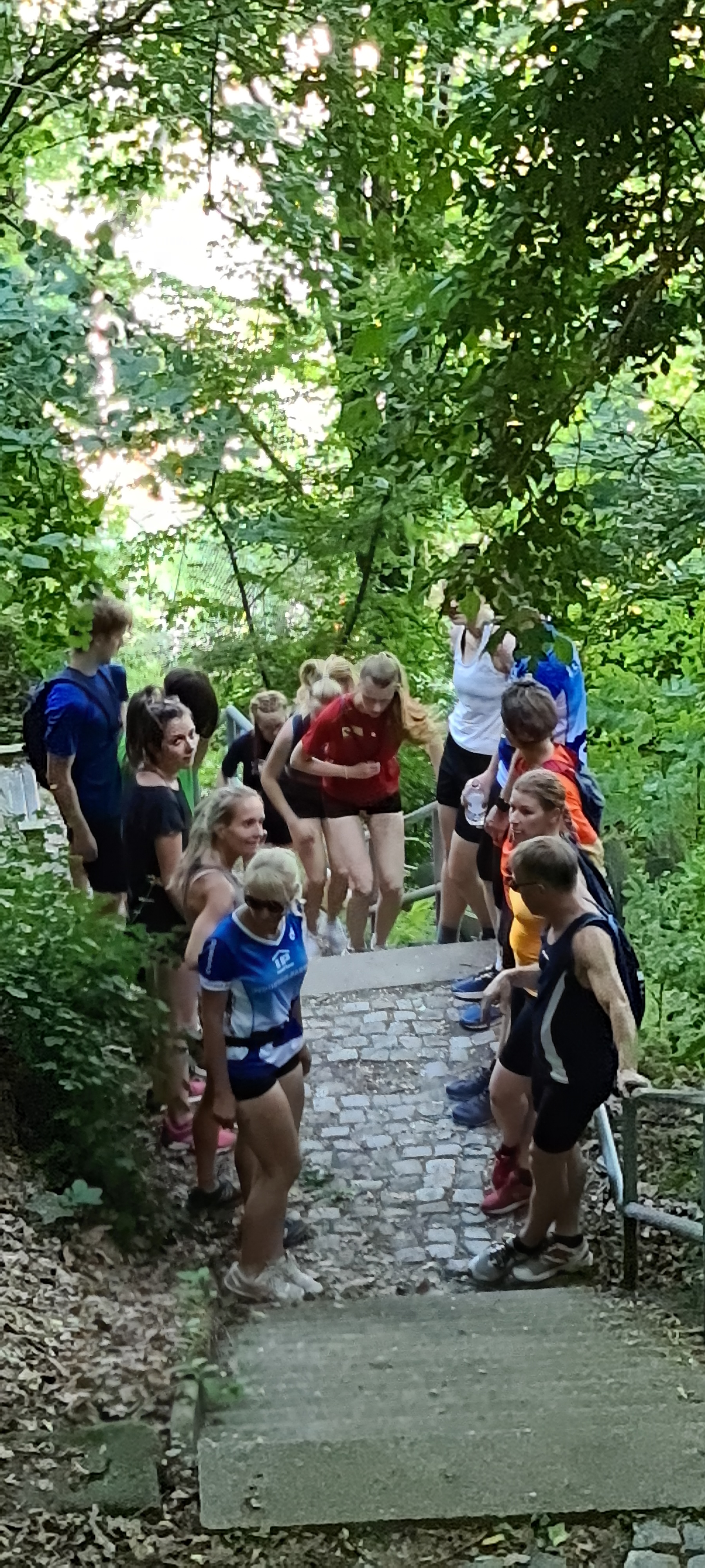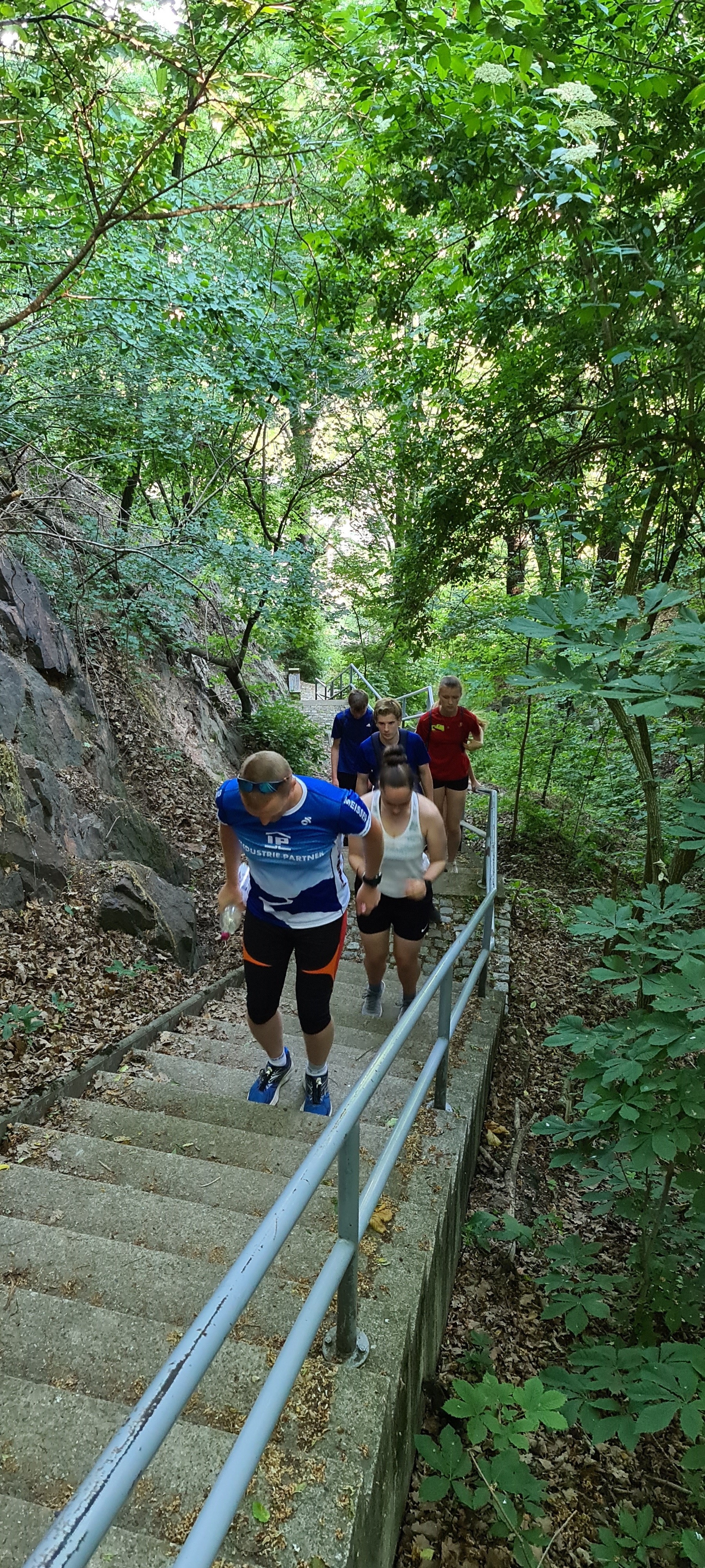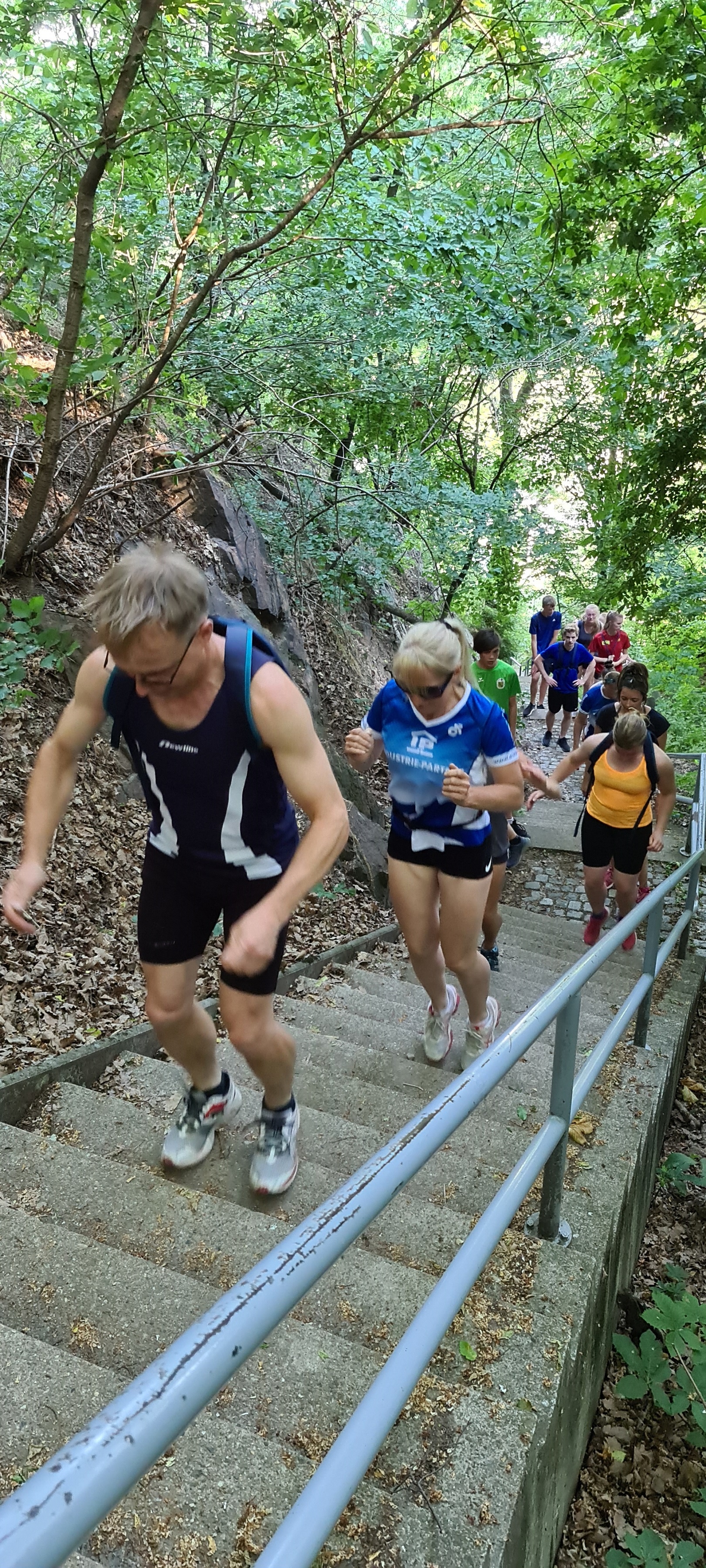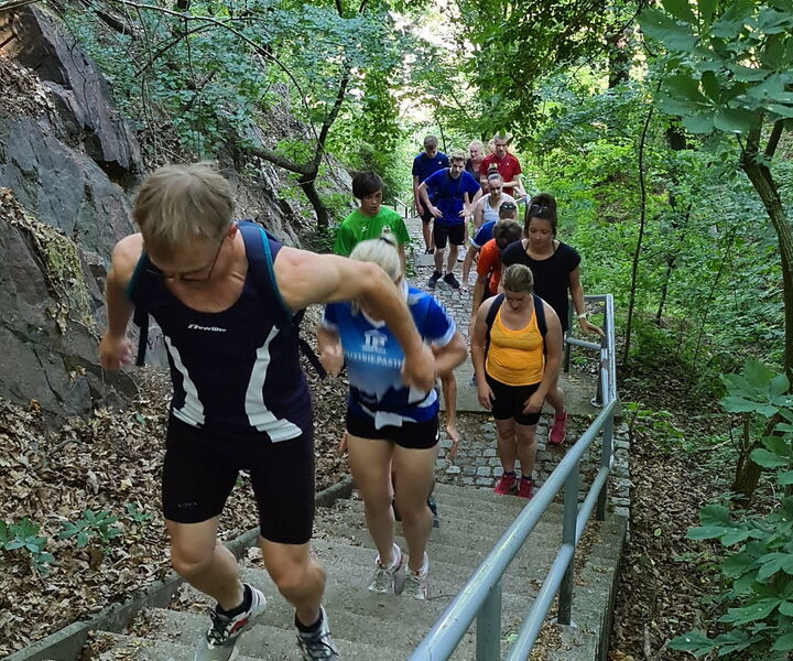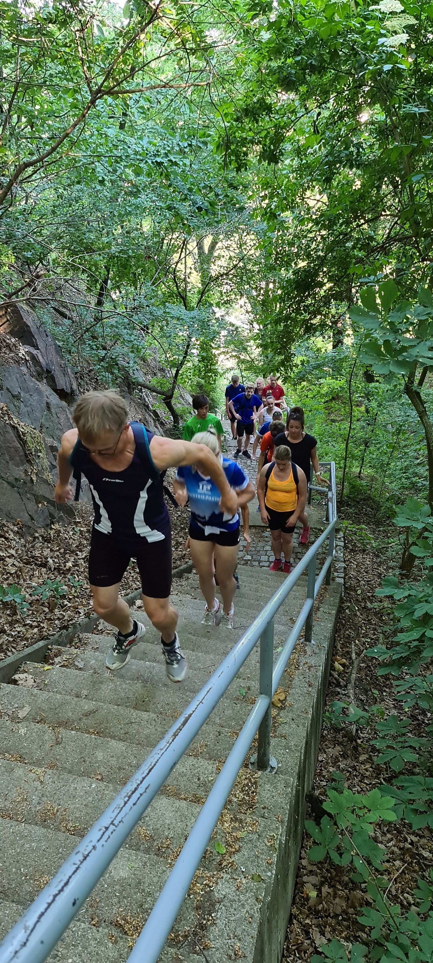 Mit unerwarteten 16 Sportlern ging es im lockeren Dauerlauf durch die Weinberge des Proschwitzer Katzensprung‘s. Nachdem im Schatten unterhalb der Katzenstufen die Gymnastik durchgeführt wurde, ging es über die 200 Stufen 2 Mal mit verschiedenen Übungen. Für einige eine schon anstrengende Sache. Oben angekommen liefen wir langsam über die „Schönste Weinsicht Sachsens 2016“ in den kühlen Heiligen Grund. Nachdem dort noch am Teich einige Übungen gesportelt wurden, sind alle unverletzt ins Stadion gegangen.