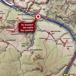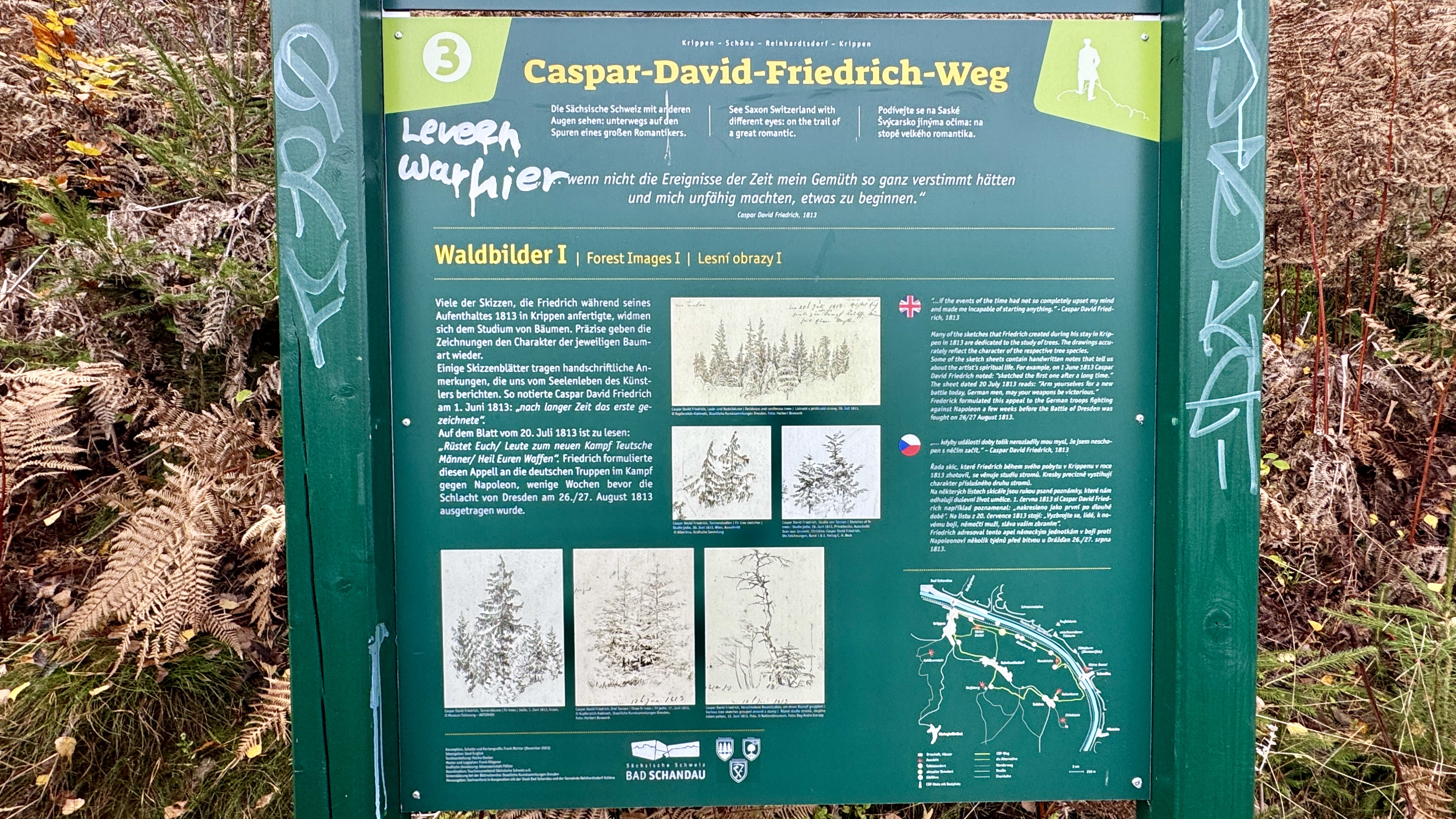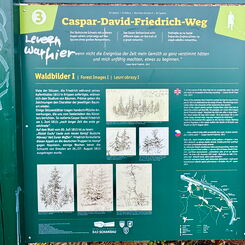 Ein kurzes Stück an der Hauptstraße entlang, erreichten wir den Ortskern. Nach der abbiegenden Hauptstraße unter einer Bahnunterführung informierten einige Schautafeln über den Maler Caspar-David-Friedrich und dessen gut beschilderten Weg durch die Sächsische Schweiz. Dafür wurden auch 11 Schautafeln aufgestellt, an denen der Maler bekannte Bilder gemalt hatte.