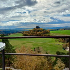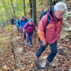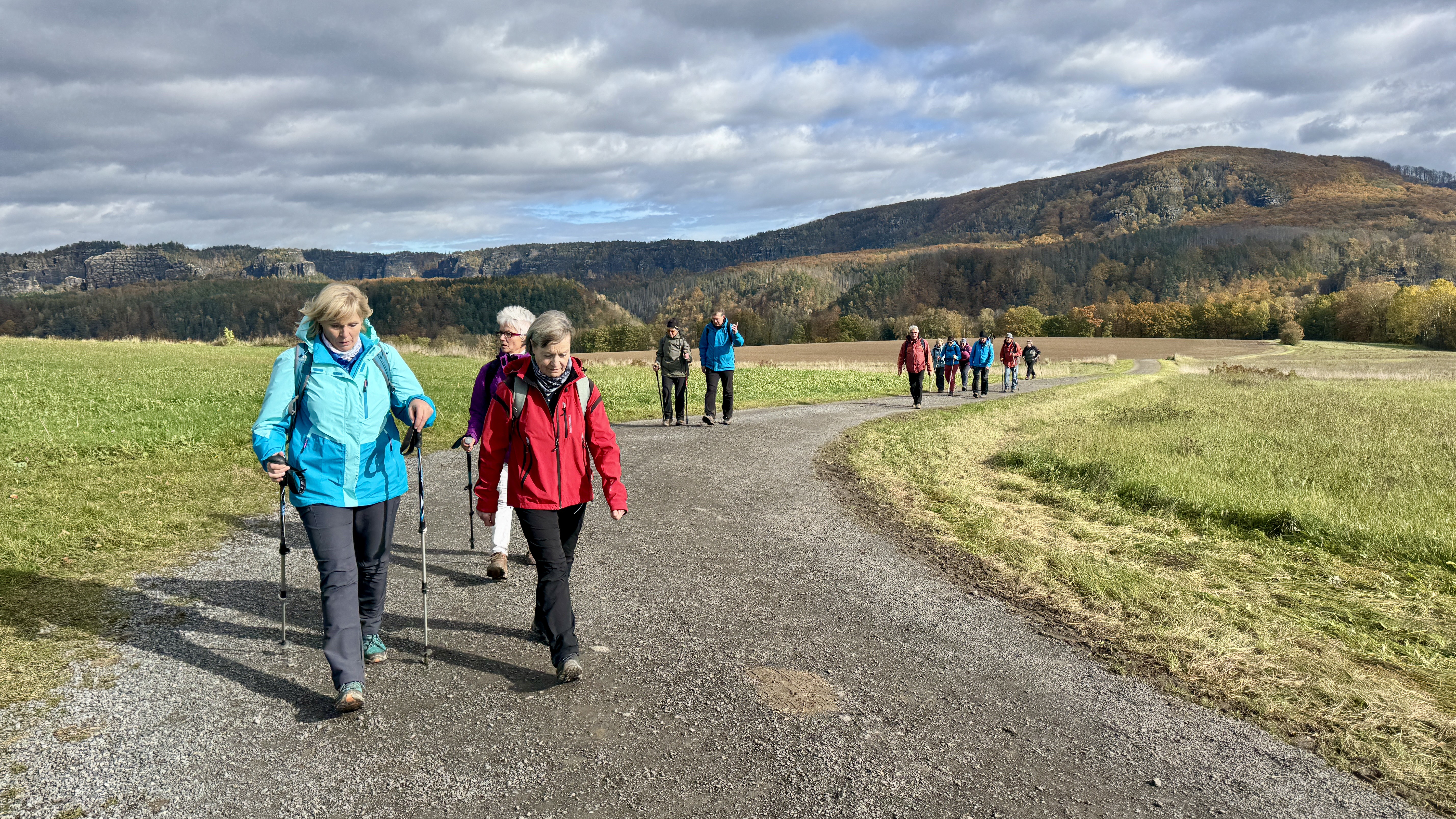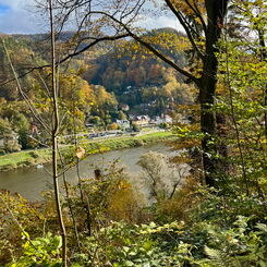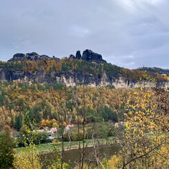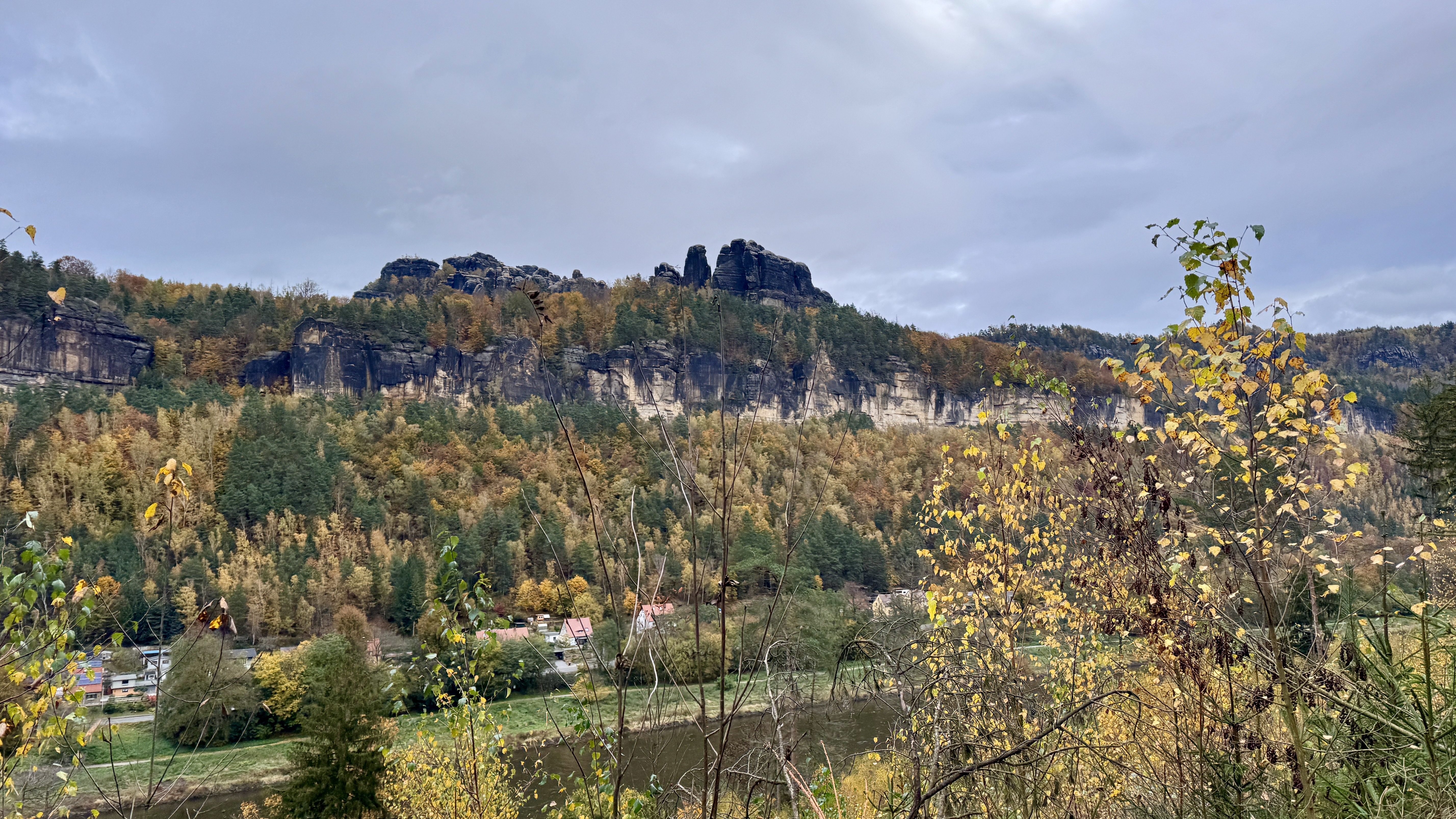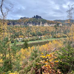 An der Bahntrasse entlang, nach ca. 400 m, ging es einen steilen Anstieg zum Mittelhangweg hinauf. Der Herbst und der schon einsetzende Laubfall gaben uns herrliche Blicke auf die Elbe und das Elbsandsteingebirge frei. Wir sahen die Gute-Ader-Wand, das Schrammsteingebiet, den Bismarckfelsen und die Kleine Bastei auf der anderen Elbseite.