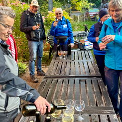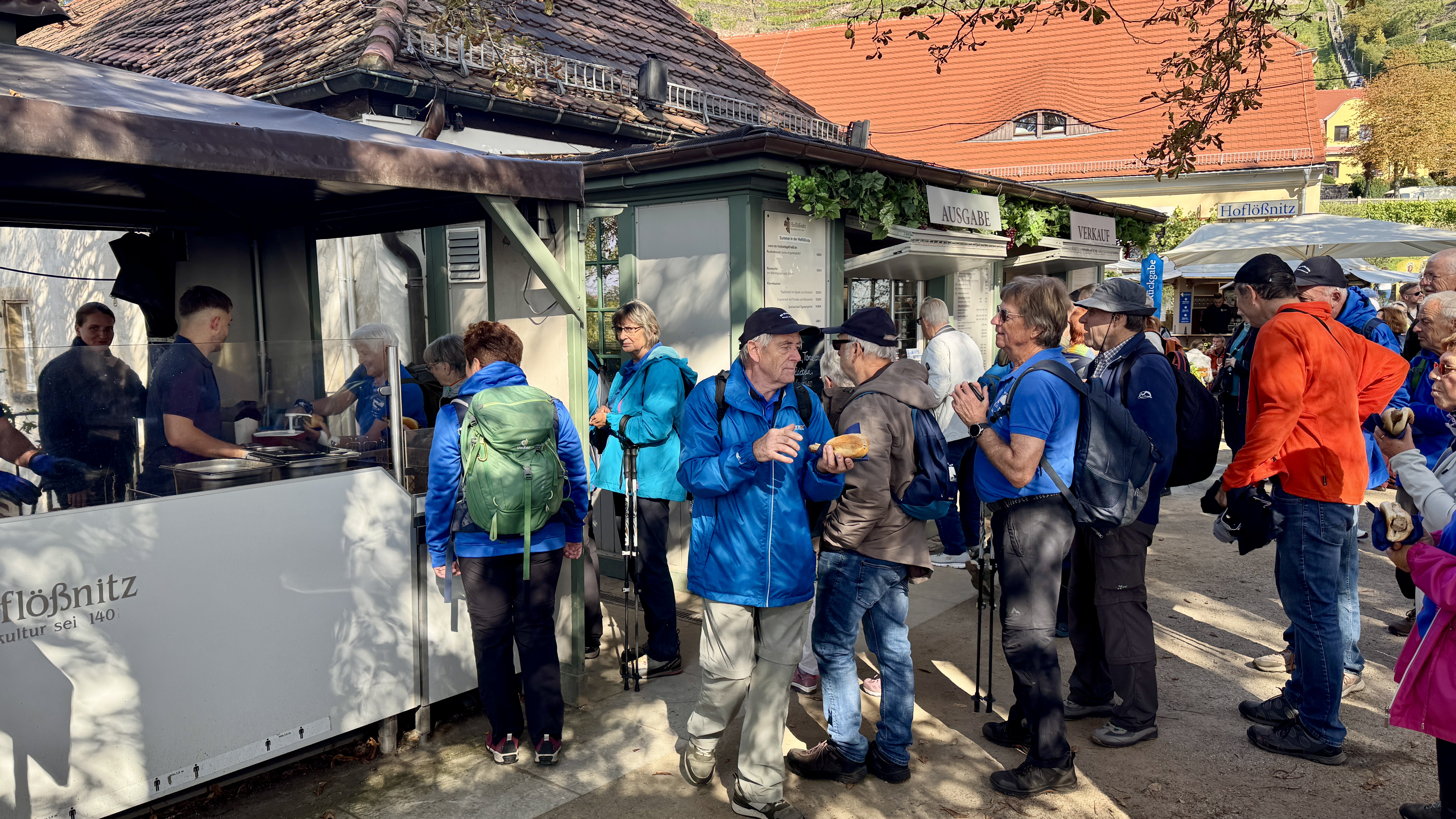Beschwingt wanderten wir über Lindenau, den wunderschönen Dreizehn-Brückenweg und dem Bilzwanderweg zu unserem nächsten Ziel dem ältesten Weinguts Sachsens der „Hoflößnitz“. Hier machten wir Pause mit einem erfrischenden Glas Wein nach Wahl und einer leckeren Bratwurst.